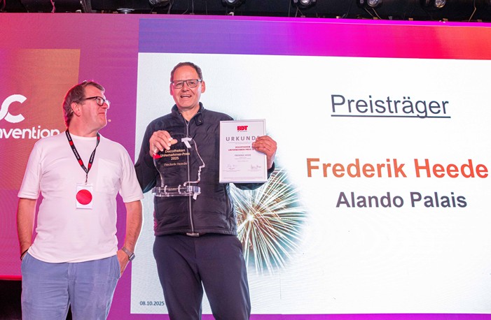 Der Bundesverband deutscher Discotheken und Tanzbetriebe e.V. (BDT im DEHOGA Bundesverband) hat auf seinem Branchentreffen "Club Convention" in Berlin die höchste Auszeichnung der Branche vergeben: den Discotheken-Unternehmerpreis. Die begehrte Trophäe erhielt in diesem Jahr Frederik Heede. Er hatte eine Vision: Aus dem Pottgrabenbad in Osnabrück wurde das einzigartige Alando Palais - ein Club- und Eventkomplex, der weit über die Grenzen der Stadt hinaus Maßstäbe gesetzt hat. In 25 Jahren hat er das Alando immer wieder weiterentwickelt, modernisiert, ergänzt. Wo andere zufrieden die Hände in den Schoß gelegt hätten, kam bei ihm die nächste Idee, die nächste Vision. Vor Clubbetreibern aus ganz Deutschland und Österreich überreichte der BDT-Präsident Holger Bösch den begehrten Branchen-Award. In seiner Laudatio hob der BDT-Präsident die herausragenden Leistungen des Unternehmers hervor und betonte den stetigen Ausbau und die Weiterentwicklung des Unternehmens.