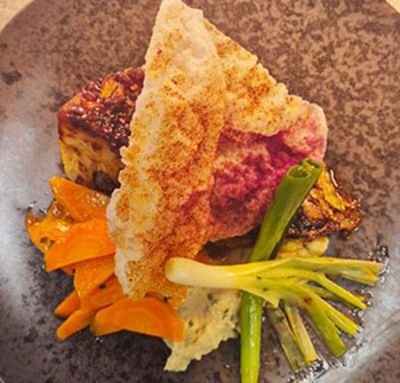 Moritz von Schulzendorf (Azubi im Hoflokal, Zoo Hannover) und Kharish Fahad Haram (Azubi im Restaurant Werkhof, Nordstadt) bereiten ein Miso-Butter-Spitzkohlsteak mit Limabohnen-Püree und Balsamico-glasierten Karotten zu – beide Azubis sind erst im 2. Lehrjahr.